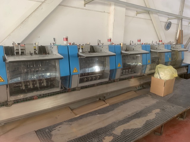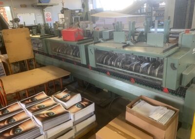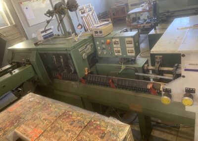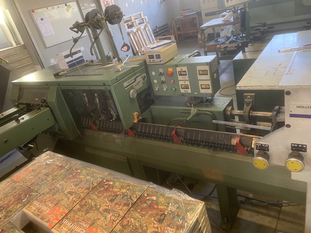 CUCITRICE A PUNTO METALLICO MULLER MARTINI MOD.1509 1 stazione di puntatura a mano 6 mettifogli piegacopertine 1528 2 teste cucenti trilaterale uscita cassetto visibile in funzione